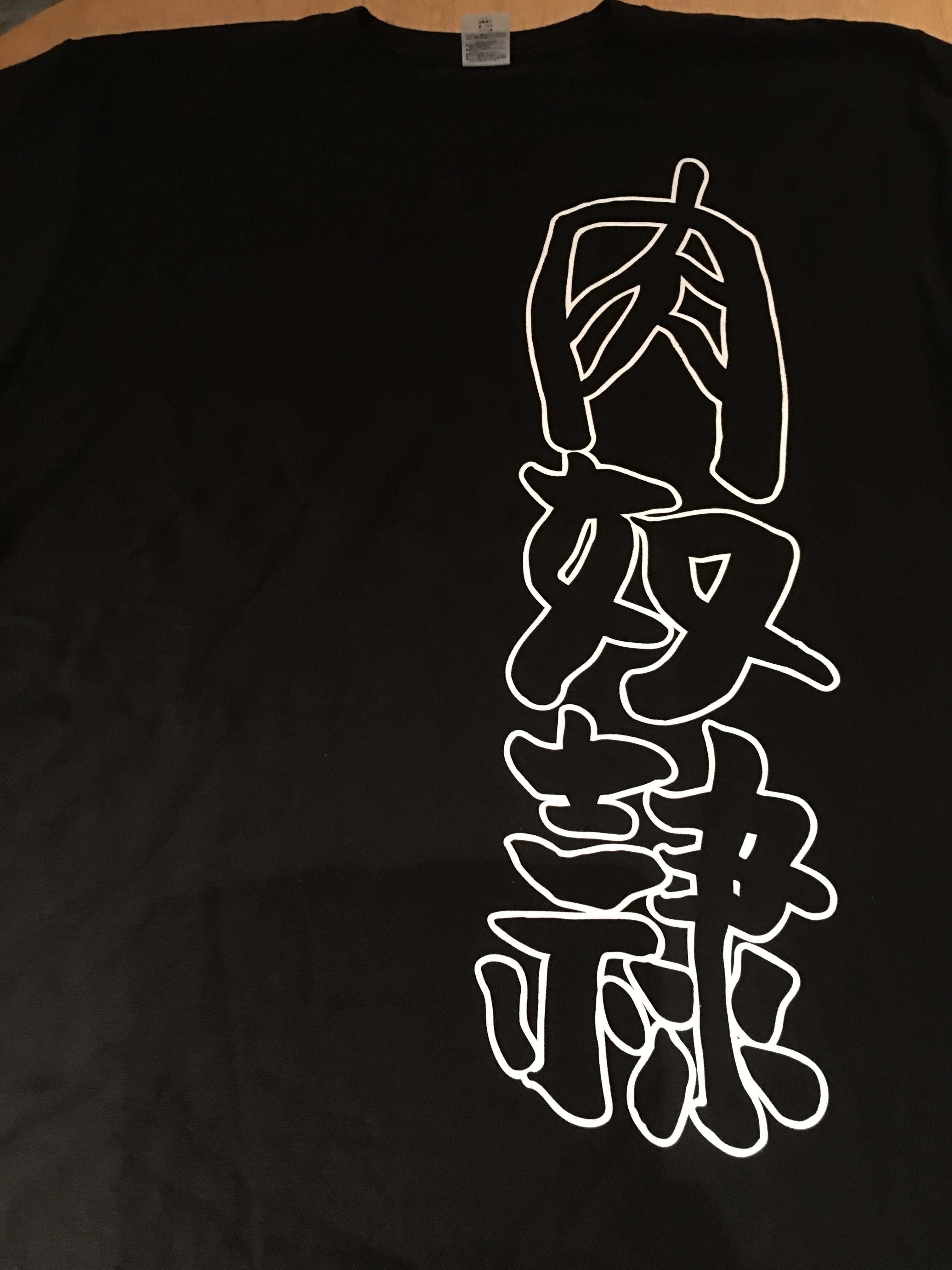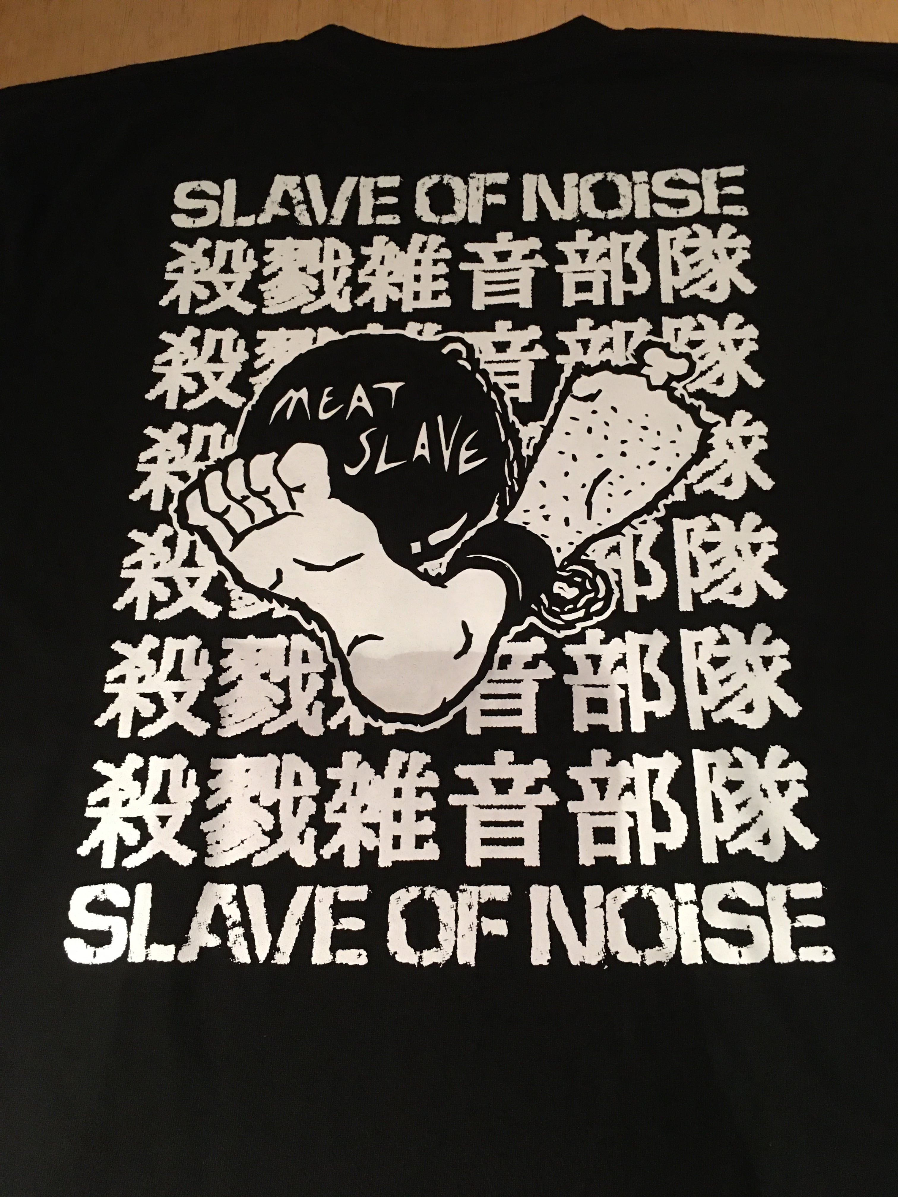 フロントに肉奴隷ロゴ、バックは主宰するライブイベント『殺戮雑音部隊』のタイトルをあしらったデザイン。